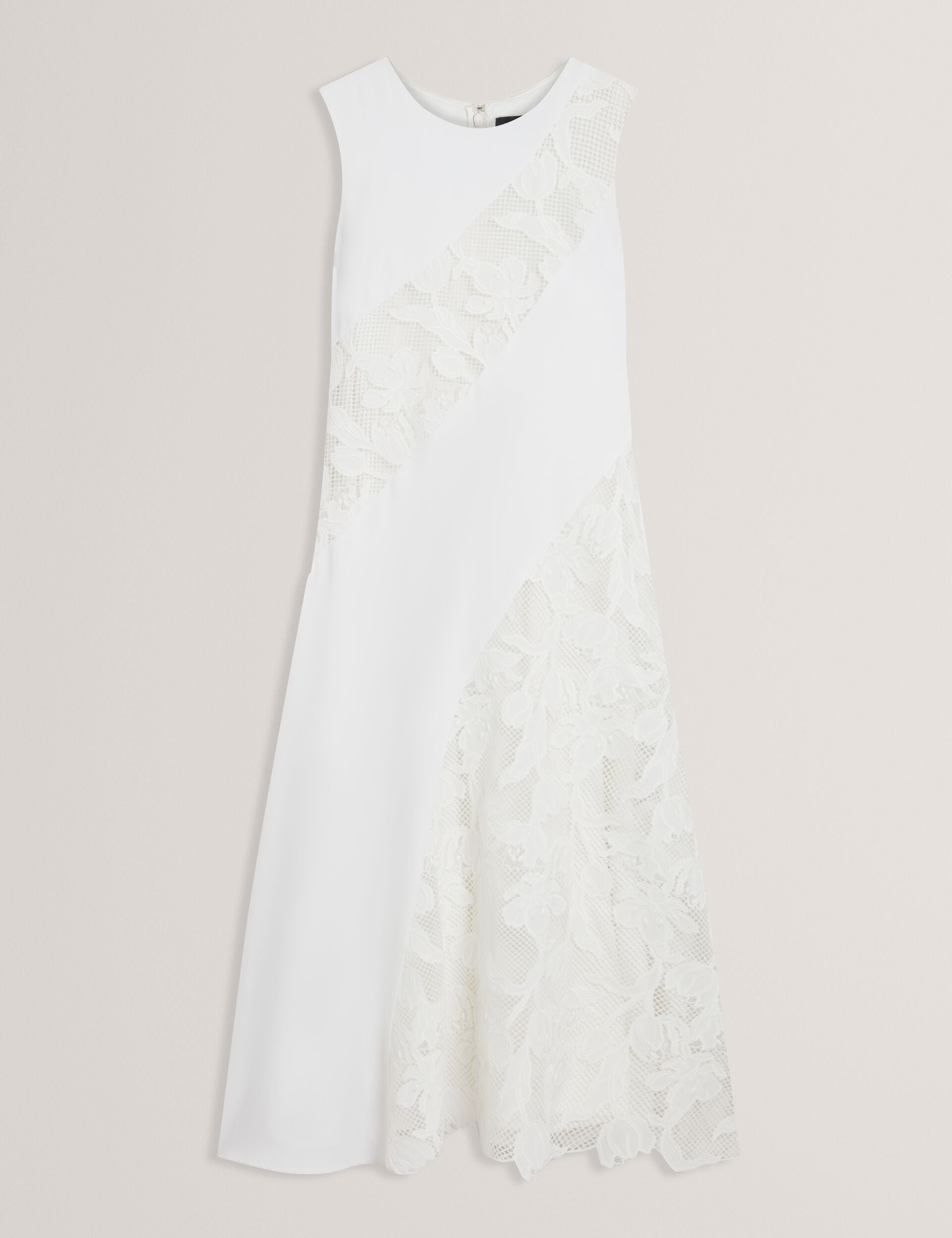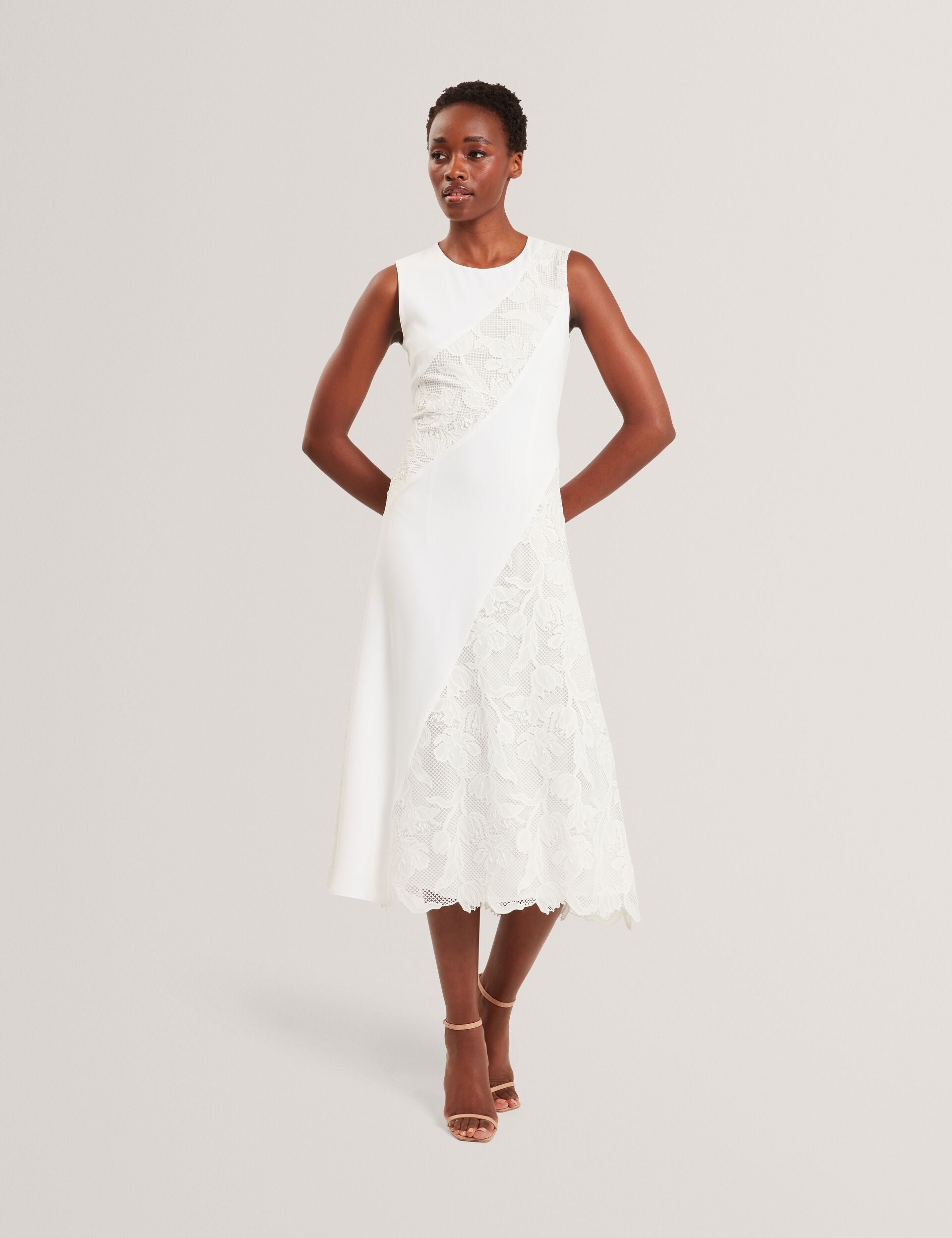 This dress exudes timeless elegance, with delicate lace detailing that adds a touch of romance, while its midi length and flattering silhouette make it the perfect choice for an elevated, chic look.
