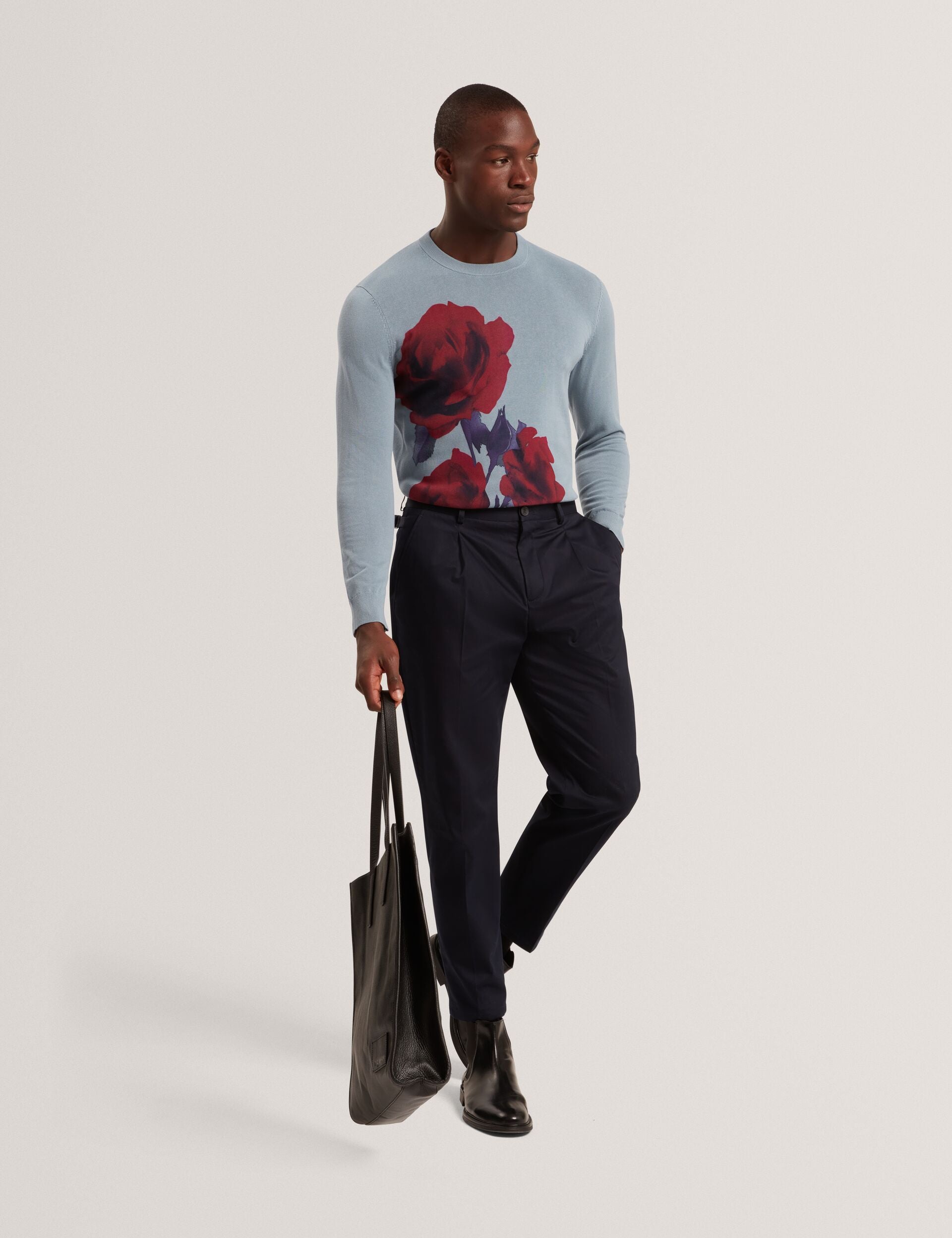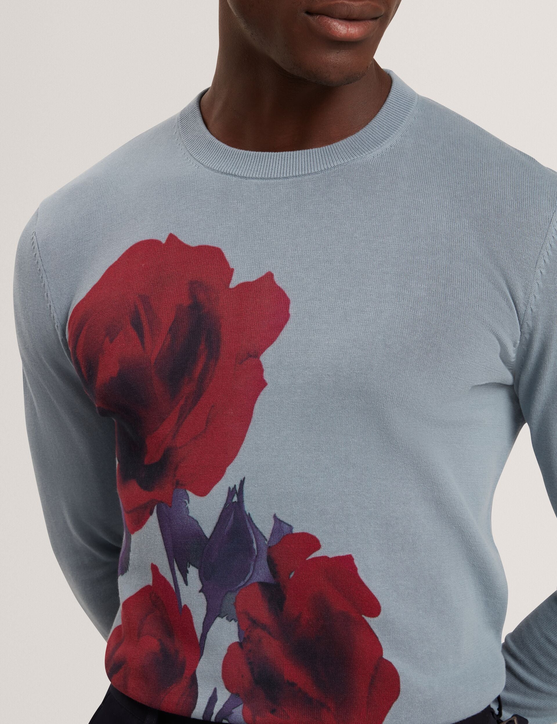 Rich colour, bold print, and irresistibly soft fabric. THALIO takes your seasonal dressing to the next level with its fine gauge knit and a red rose graphic inspired by bold heritage style. Finished with an easy crew neck, why not give this long-sleeve piece a go with your tailored trousers?