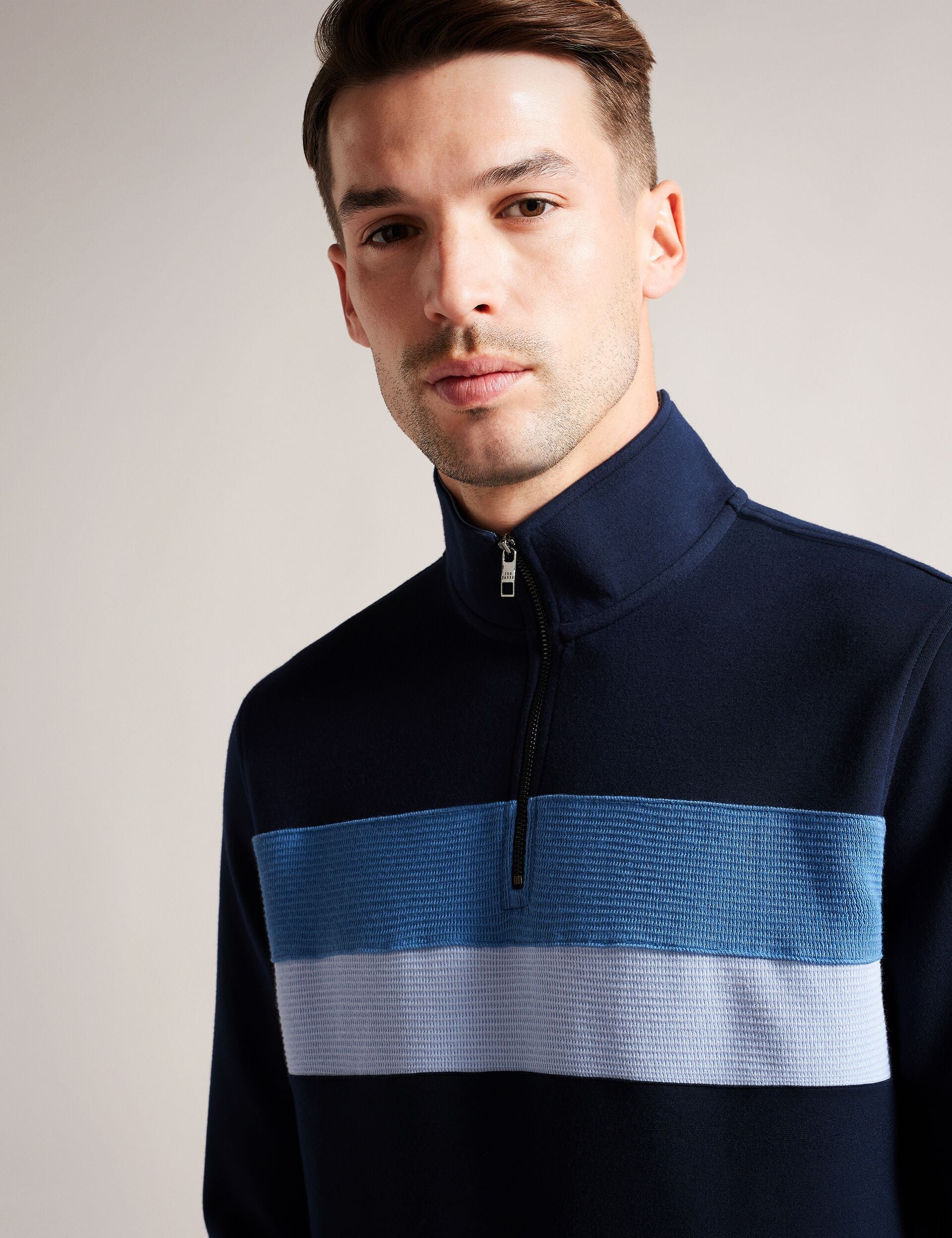 - Striped textured panel at the chest