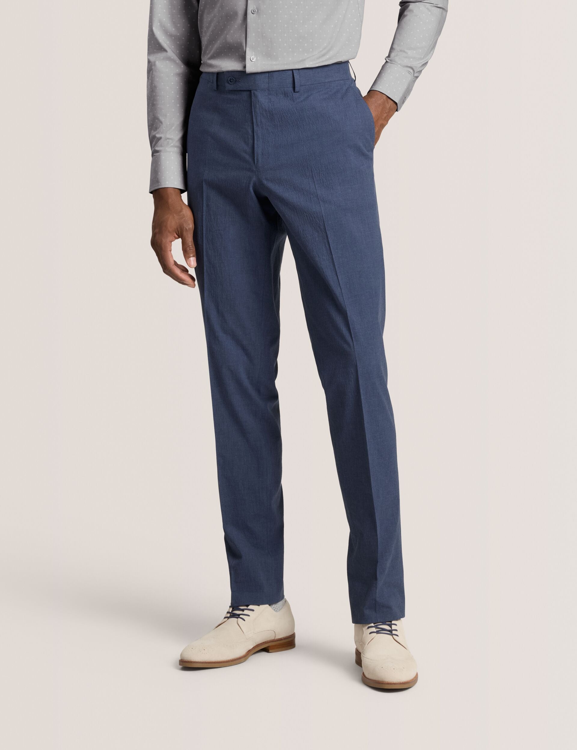 Redefine your formal wear with our effortlessly sophisticated, flat-front seersucker suit trousers. Perfectly blending timeless elegance with a modern twist, these trousers add a touch of texture and flair to any ensemble, making them an essential addition to your wardrobe. Pair them with a crisp shirt for a polished office look or dress down with a casual knit for a weekend affair.