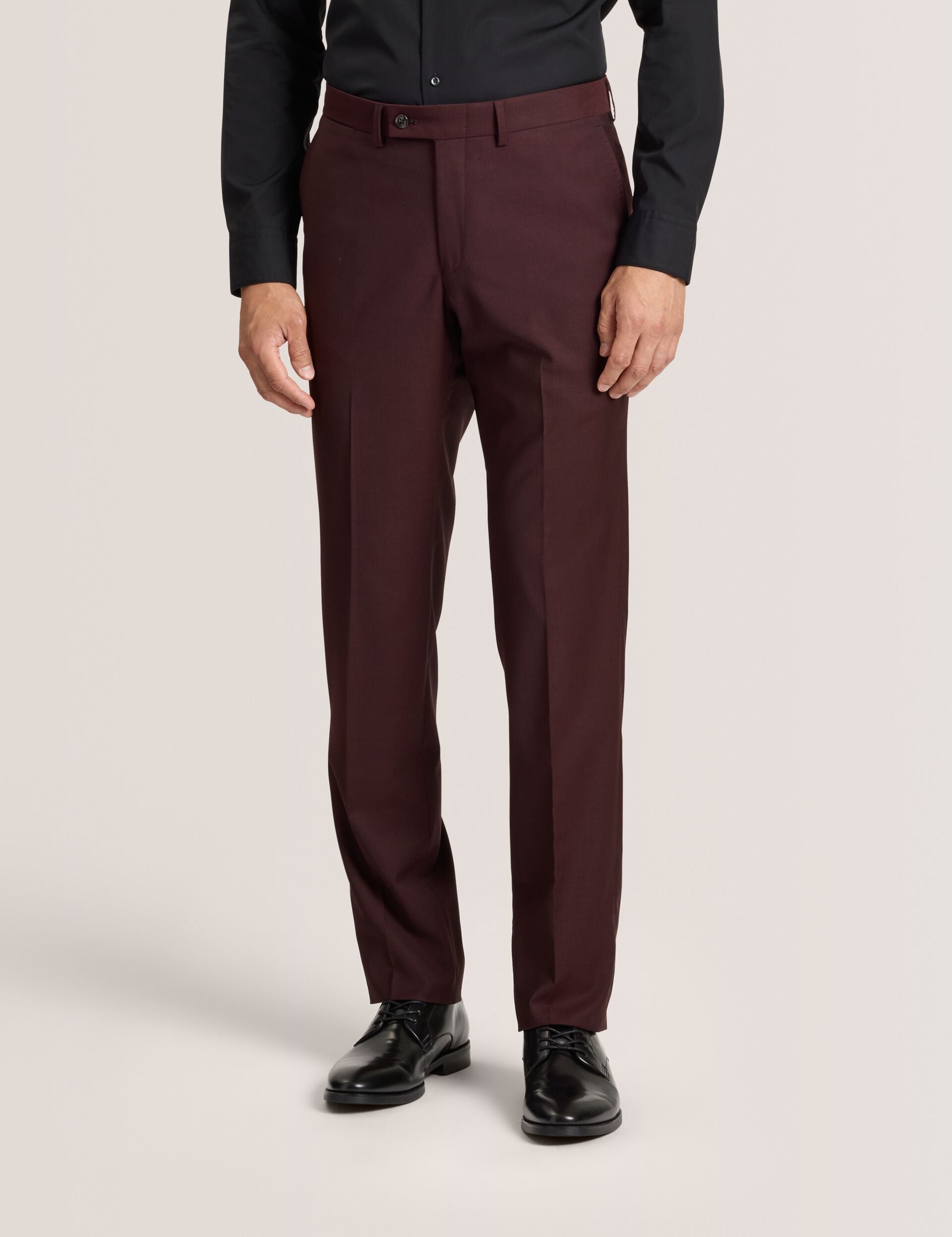 The Winter-Twill Suit Pant is a modern wardrobe essential, crafted from a soft wool-blend fabric with a smooth twill texture. Tailored in a slim fit for a refined silhouette, these trousers feature a clean front with a hook-and-bar fastening and practical belt loops for everyday versatility. The deep burgundy tone adds a sophisticated touch—perfect for pairing with the matching jacket for a polished head-to-toe look.